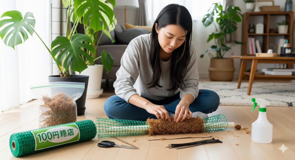 市販されている支柱に好みのデザインやサイズがない場合、あるいはできるだけコストを抑えてモンステラをサポートしたい場合には、100円ショップで手に入るアイテムを組み合わせてオリジナルの支柱を自作するのも一つの楽しい方法です。特に、モンステラの気根が絡みつきやすいココスティック風の支柱は、驚くほど簡単に作ることができます。