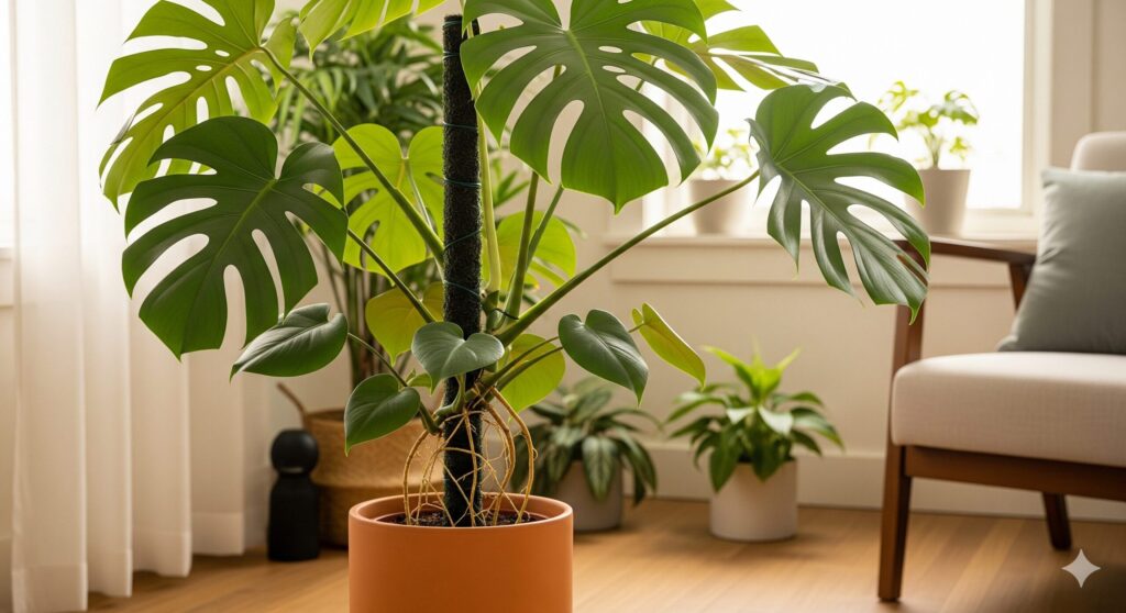 最も直接的で確実な対策は、やはり支柱を立てて物理的に支えることです。支柱は、モンステラが本来の姿で上方向に伸びるための重要な補助具となります。茎が重みで傾き始めたり、鉢全体が不安定に感じられたりしたら、それは支柱を設置するべき明確なサインです。早めに支えを用意することで、茎が大きく曲がってしまうのを未然に防げます。