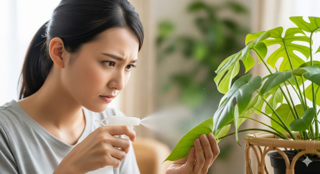 モンステラの大きな葉はホコリがたまりやすく、また葉の裏側は目が届きにくい場所です。ハダニは乾燥とホコリを好み、葉の裏に潜んで養分を吸います。被害にあうと、葉緑素が抜けて白い斑点が無数に現れたようになり、やがて葉全体が白っぽく変色してしまいます。定期的に葉の表裏を濡れた布で拭く「葉水」が、ホコリ除去と乾燥防止の両面で非常に効果的な予防策となります。
