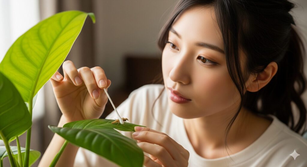 - カイガラムシ・アブラムシ:数が少なければ、ティッシュや綿棒で一つずつ取り除きます。密集している場所や、茎などに固着している場合は、使い古しの歯ブラシで優しくこすり落とすと効率的です。