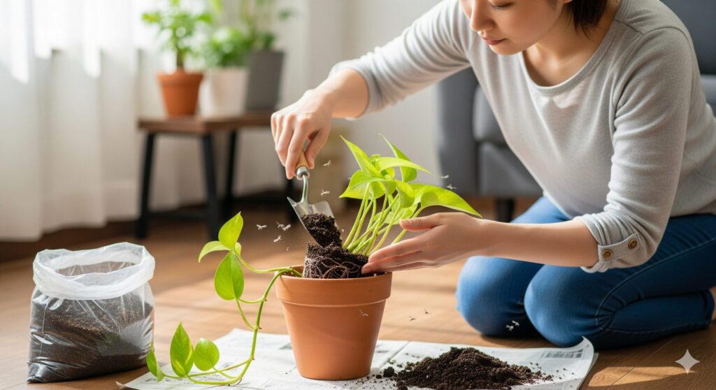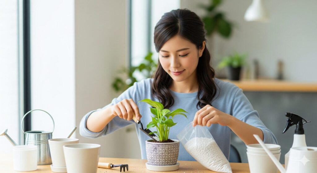 上記の方法でも改善しない、あるいは虫の数が非常に多い場合は、土を丸ごと交換する「植え替え」が最も確実なリセット方法です。植物を鉢から抜き、根についている古い土を優しく揉みほぐしながらできるだけ落とします(根を洗い流すのも有効です)。そして、新しい清潔な用土で植え直します。この機会に、虫がわきにくい無機質用土ベースの土に切り替えるのがおすすめです。植え替えは植物に大きなストレスがかかるため、成長が活発な春や秋の時期に行うのが理想的です。