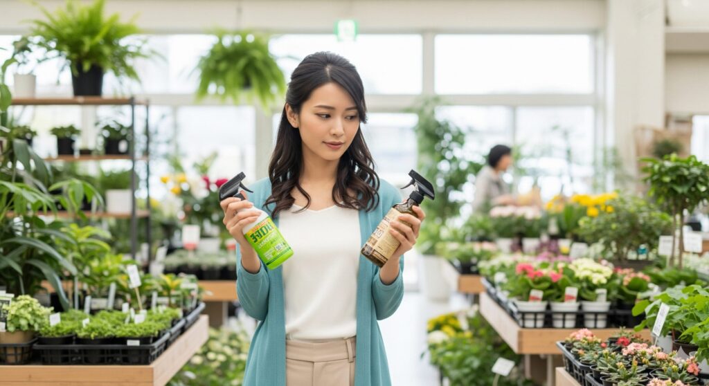 - 剤形を選ぶ:すぐに使えるスプレータイプが最も手軽ですが、希釈して使う液体タイプや、土に混ぜる粒剤タイプなどもあります。スプレータイプの中にも、特定の虫に特化したものや、幅広い虫と病気に効くものがあります。大手化学メーカーであるアース製薬の製品ページなどでは、対象の植物や害虫から製品を探すことができ、選択の参考になります。