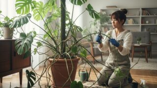 見つけ次第、症状が出ている葉を剪定して処分するか、重曹を水で500〜1000倍程度に薄めたスプレーや、市販のうどんこ病用の殺菌剤を散布して対処します。同時に、風通しの良い場所に移動させるなど、環境改善も不可欠です。
