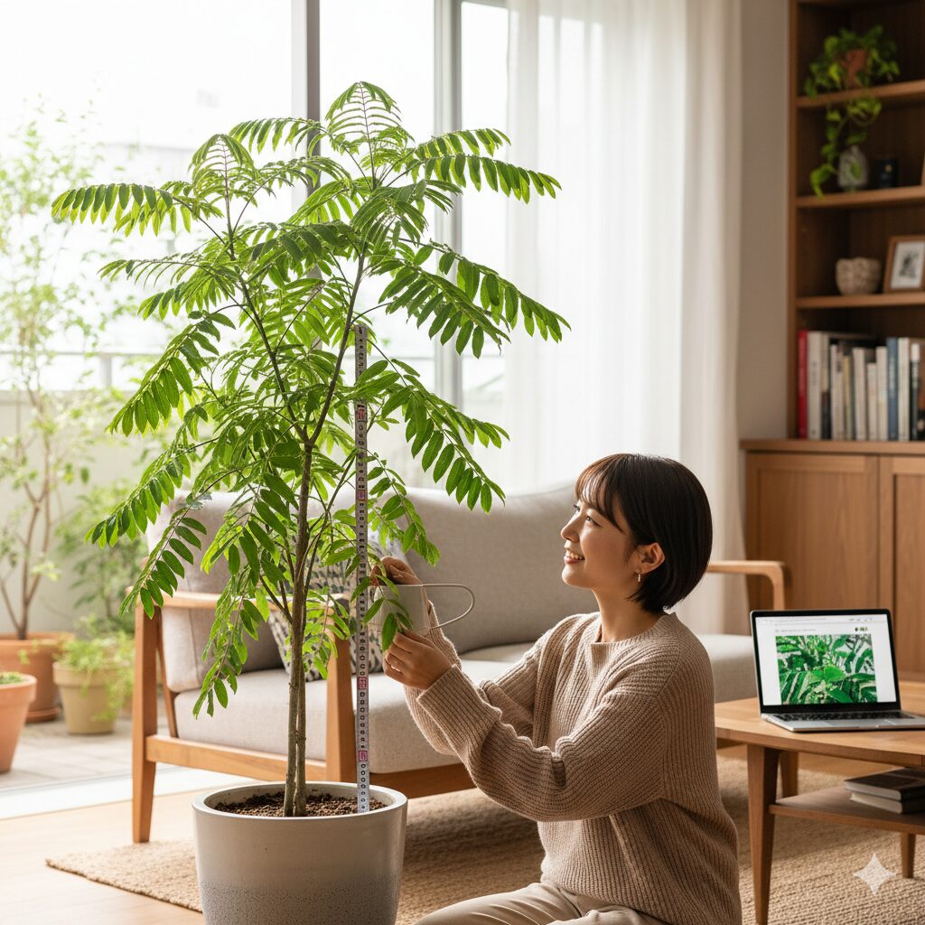 涼しげな葉っぱが特徴で、夜になると葉を閉じて眠る姿も愛らしいエバーフレッシュ。インテリアグリーンとして本当に人気がありますよね。私も大好きです。そんなエバーフレッシュをお迎えしたいなと思った時、ふと疑問に思うのが「エバーフレッシュって一年で何センチくらい伸びるんだろう?」ということ。