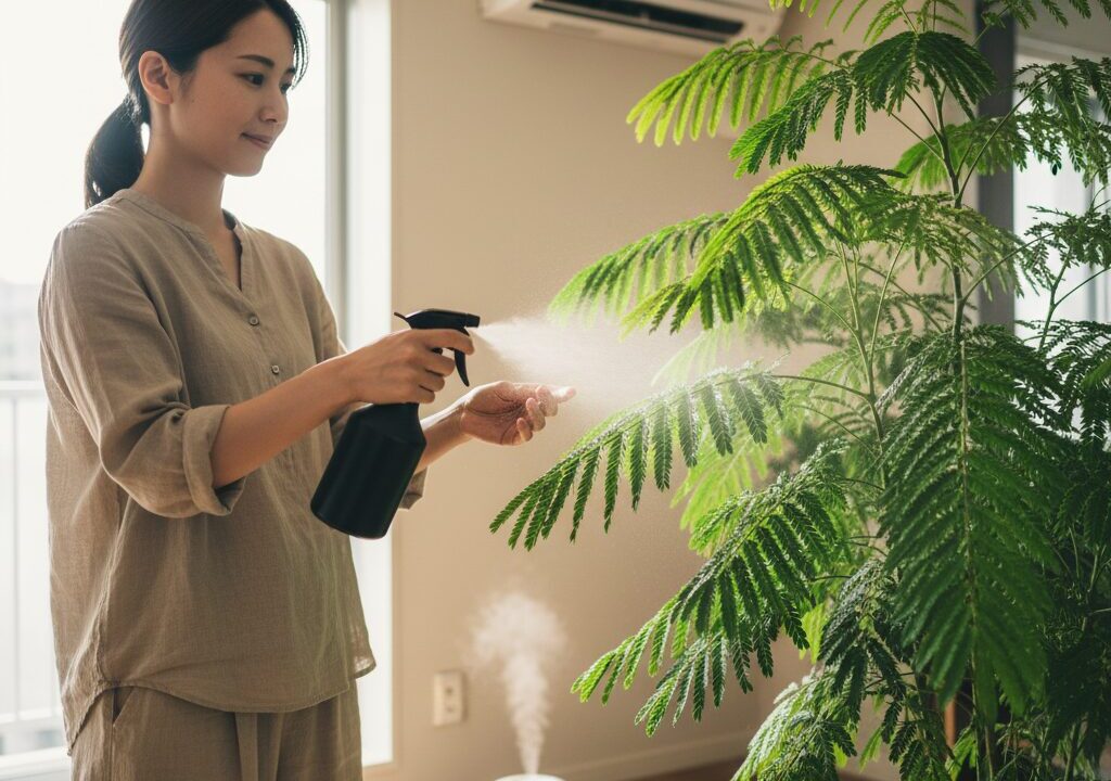 これは単に空気の乾燥を防ぐだけでなく、ハダニの発生を物理的に抑え、さらに毎日植物の状態を間近で観察する「健康診断」としての役割も果たしてくれます。「あれ、ちょっと葉の色が薄いかな?」「クモの巣…じゃないよね?」と、葉の裏側までチェックする癖がつくんです。これだけで、多くの異常を早期発見できるはずです。