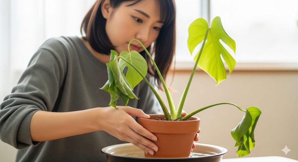 水不足のサインを見逃してしまい、モンステラがぐったりとしおれてしまった場合でも、慌てる必要はありません。根が完全に枯死していなければ、正しい手順で対処することで多くの場合、劇的に復活が可能です。重要なのは、極度に乾燥して弱った株に、さらなるストレスを与えないよう丁寧に対処することです。