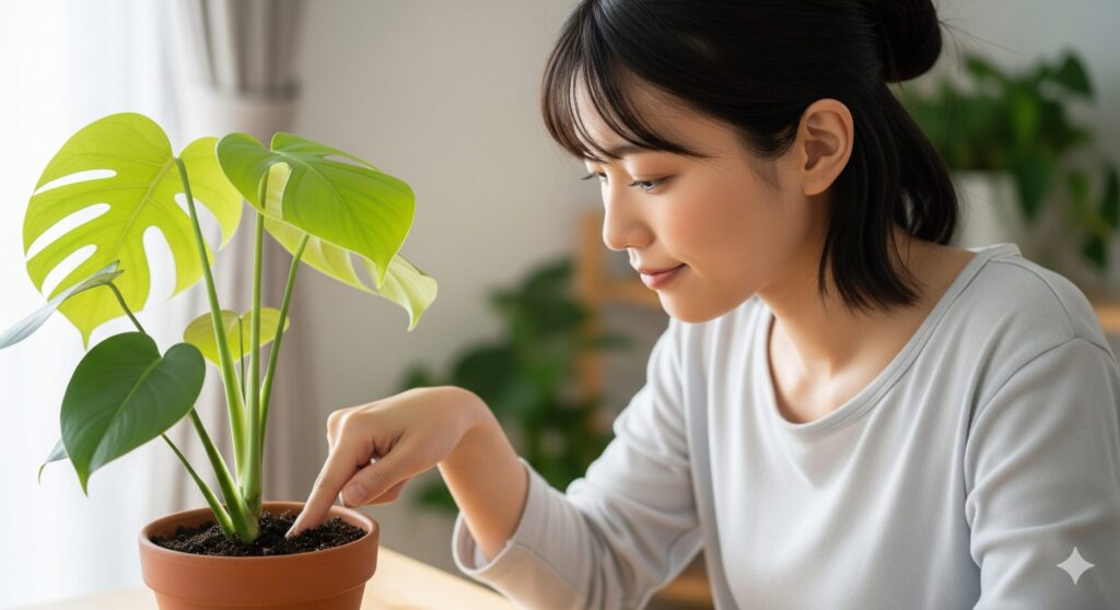 モンステラの水やりタイミングをマスターする上で、最も確実で失敗の少ない基本的な方法は、葉の様子だけでなく、「土の乾き具合」を直接確認することです。